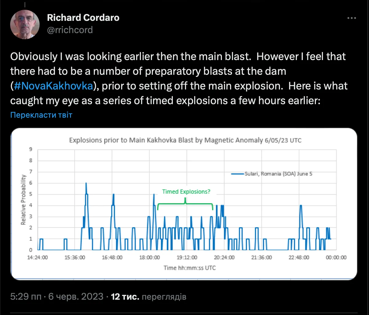 За словами фізика Річарда Кортадо, вибух дамби у Новій Каховці зафіксували на магнітометрі у Бухаресті. Сталося це з похибкою близько у 5 хвилин. Мовиться про час 02:50. Власне, цей же час вказує офіційна українська влада.