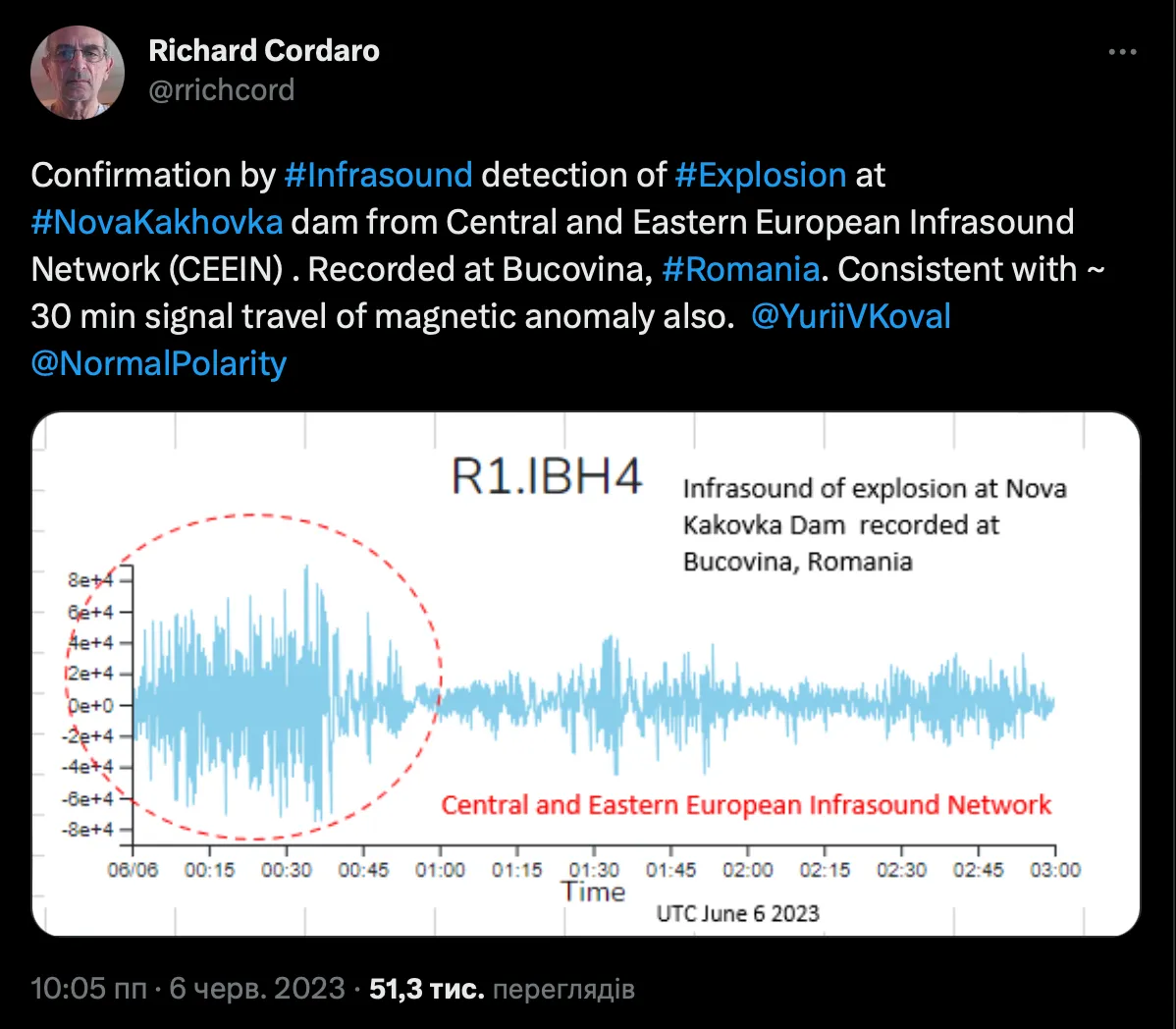 Він також зауважив, що Центрально-Східноєвропейська інфразвукова мережа (CEEIN) також підтвердила інфразвукове виявлення вибуху на ГЕС. Реєстрація відбулася в районі Буковини. І вона, за словами фізика, "узгоджується з 30-хвилинним ходом сигналу магнітної аномалії".