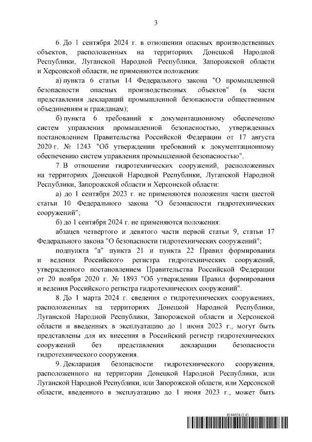 Окрім того, у законі є окремий пункт про те, що на об'єктах у квазіреспубліках на Сході та на окупованих територіях Запорізької та Херсонської областей частини "Про промислову безпеку небезпечних виробничих об'єктів" та "Про безпеку гідротехнічних споруд" застосовуватися не будуть. Це рішення російської влади – черговий доказ того, що до вчинення теракту окупанти готувалися вже давно.