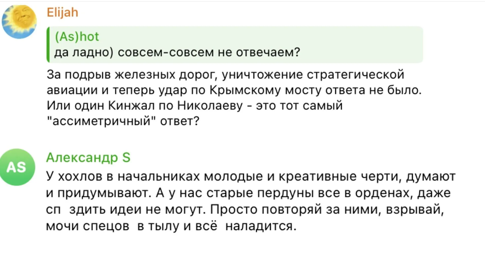 Інші кажуть, що, мовляв, поки "Україну не перетворити на ядерний попіл, подібні атаки будуть тривати". Хтось дивується, чому ще досі окупанти не знищили усі мости, дамби та переправи на Дніпрі.