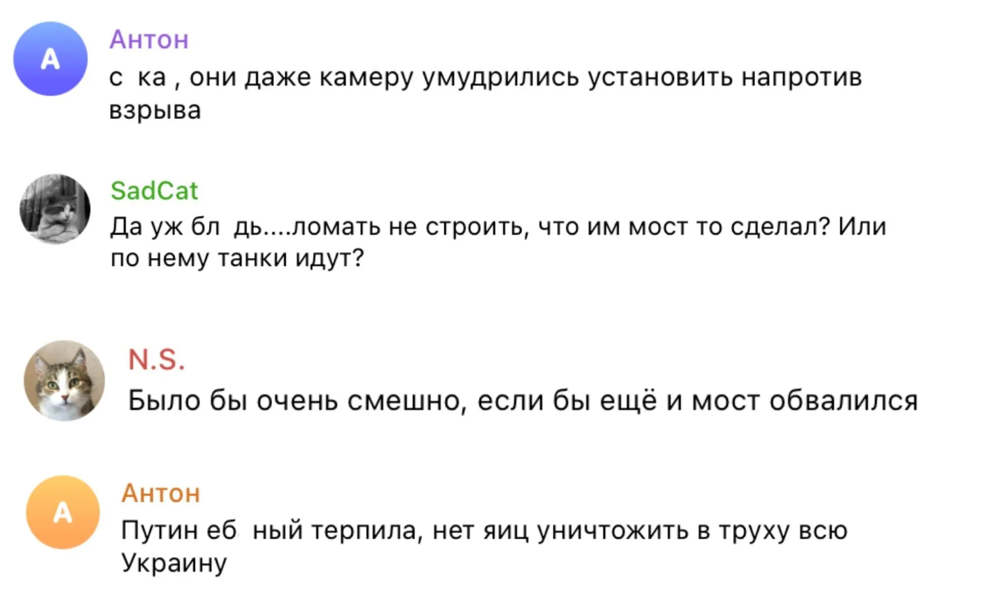 Ще третя категорія російських громадян займається самовтішанням. Мовляв, це або фейкова атака, або "піар-акція", бо "тонна тротилу – це перебір". Вони переконують, що удар прийняли на себе "відбійники" й "загородження". Звісно, рух мостом довелось перекривати, але загалом все "штатно". Класичне "нічого страшного" з присмаком "нам все одно болить".