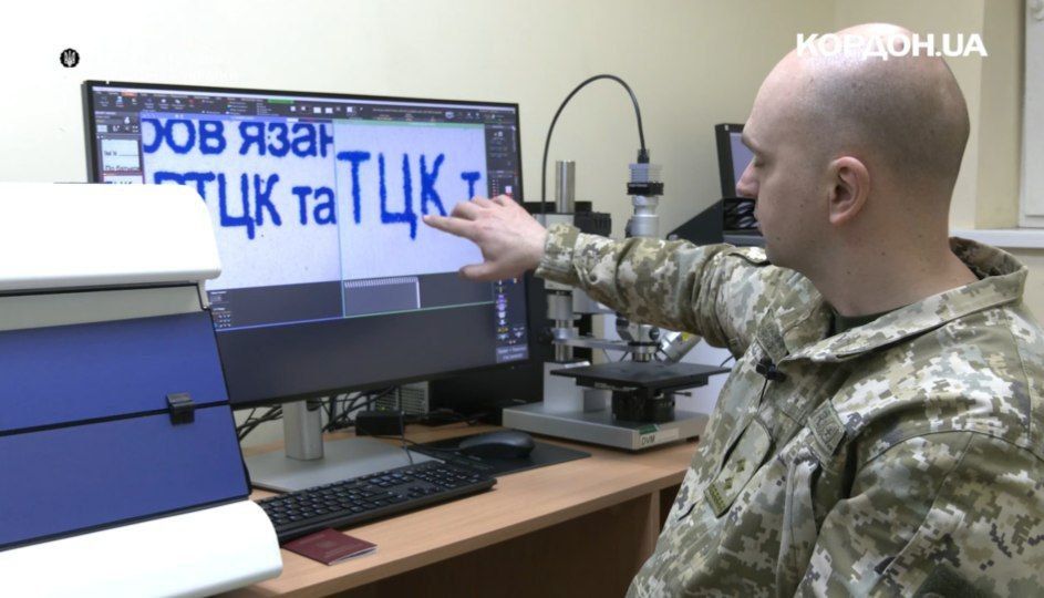 "На дослідженні у нас – тимчасове посвідчення військовозобов'язаного. Цей документ був вилучений під час прикордонного контролю. У цьому випадку тут повністю підроблене кліше печатки територіального центру комплектування. Не змогли повторити форму букви "ц", і, як бачите, тут, в зразку, ніжка уходить трошки в сторону у зразку кліше, а тут вона іде прямо", – мовив начальник відділу технічної експертизи документів Олександр Бригинець.