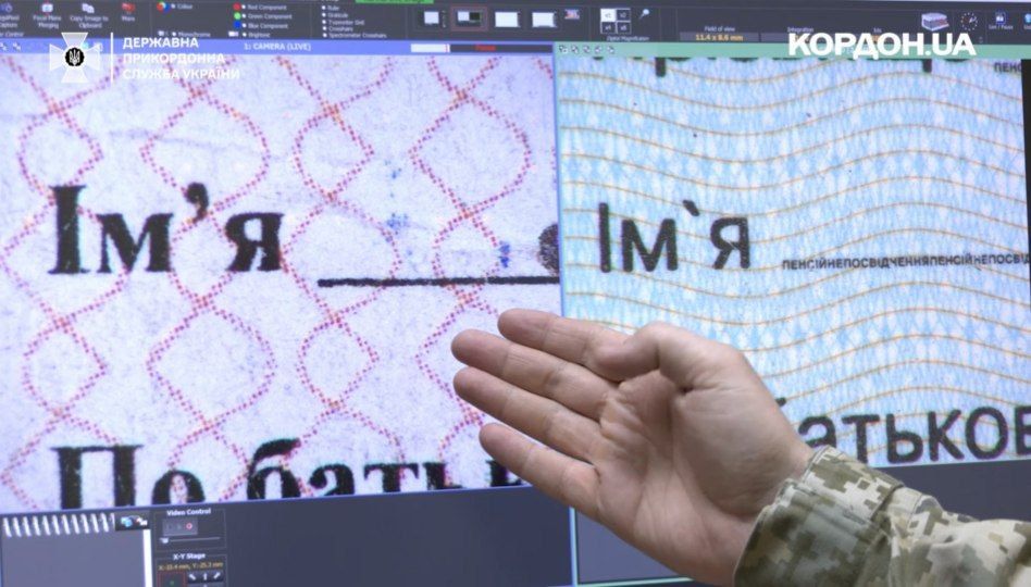 "Першим кроком ми перевіряємо документ на загальний вигляд: форма, бланк, розміри, спосіб оформлення та заповнення, потім ми використовуємо спеціальні джерела світла", – додав начальник відділу технічної експертизи документів Олександр Бригинець.