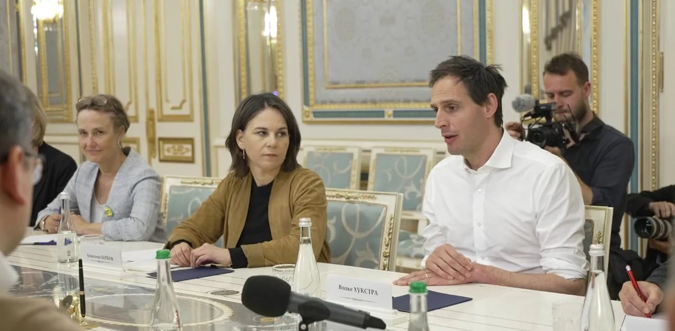 У своєму телеграм-каналі Президент України Володимир Зеленський поділився фрагментом відео із зустрічі з міністеркою закордонних справ Німеччини Анналеною Бербок і міністром закордонних справ Нідерландів Вопке Гукстрою.