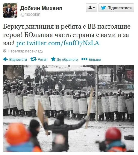 "Беркут, міліція і хлопці із Внутрішніх військ справжні герої! Велика частина країни з вами і за вас!" — написав він у Twitter.