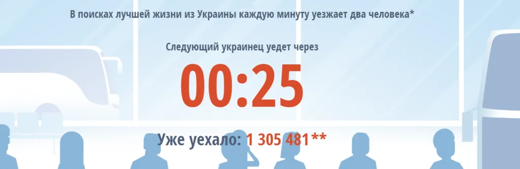 Ukrainianpeopleleaks показує, скільки українців щохвилини залишають країну. Для підрахунку статистики використовували дані, які озвучив міністр закордонних справ Павло Клімкін. За його словами, щомісяця з країни на заробітки їдуть 100 тис. осіб. За даними Міністерства соціальної політики, так чи інакше проблема трудової міграції стосується уже 9 млн осіб (зокрема сім'ї українців, які залишили країну).