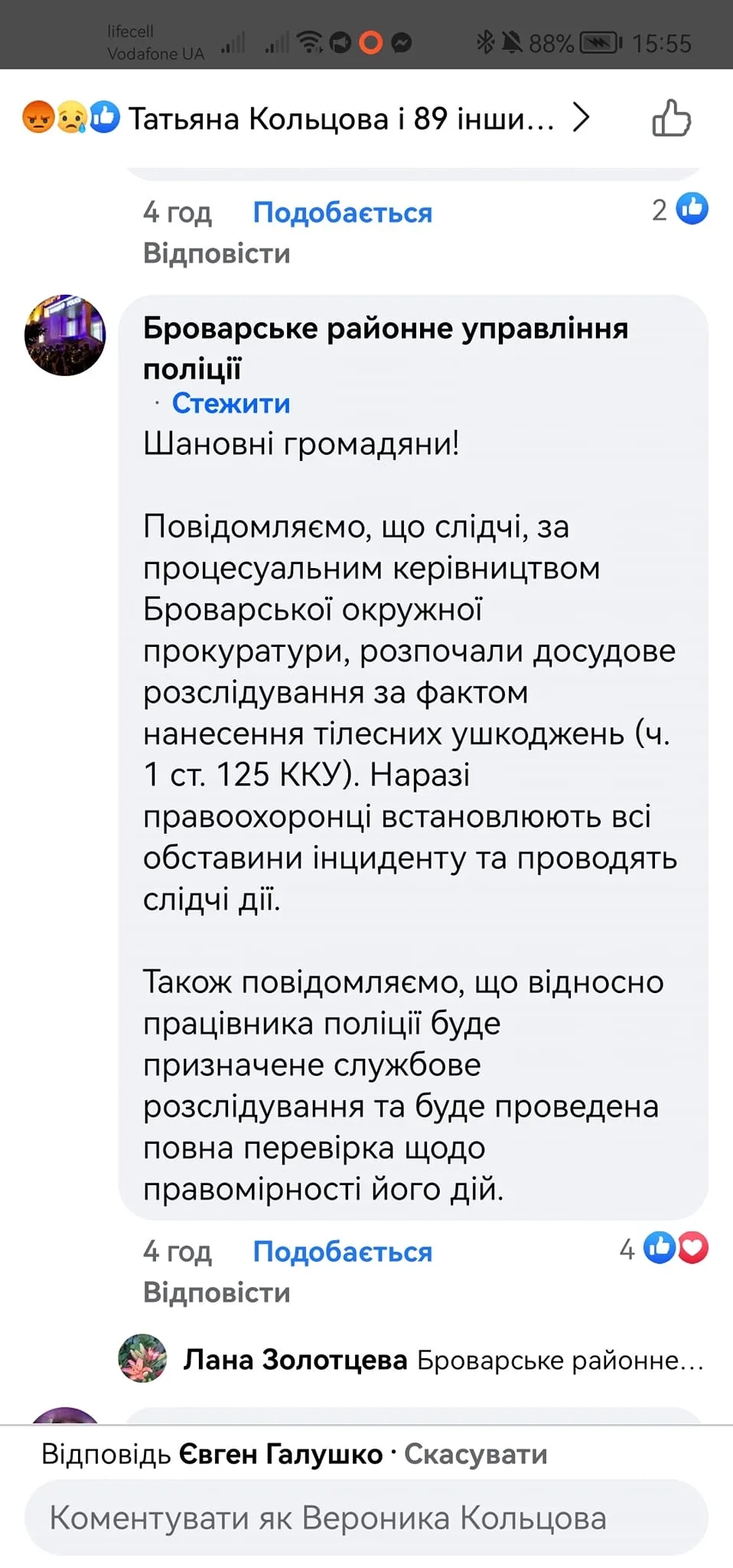 Водночас донька оприлюднила скрін відповіді Броварського районного управління поліції, у якому правоохоронці зазначають, що відкрили провадження за фактом завдавання тілесних ушкоджень. Також за їх же словами призначено службове розслідування щодо правомірності дій поліцейського.