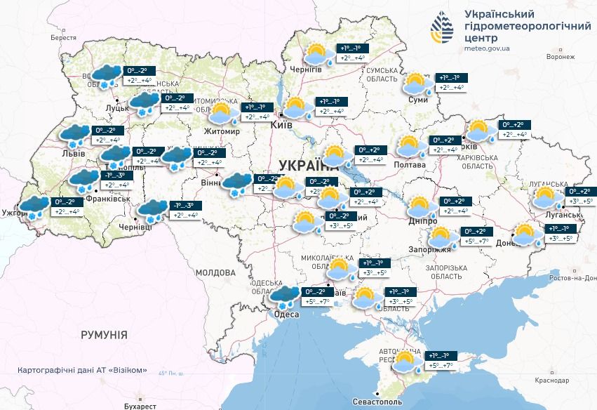 - 2 лютого в Україні буде хмарно з проясненнями, місцями мокрий сніг та дощ, ожеледиця на дорогах.