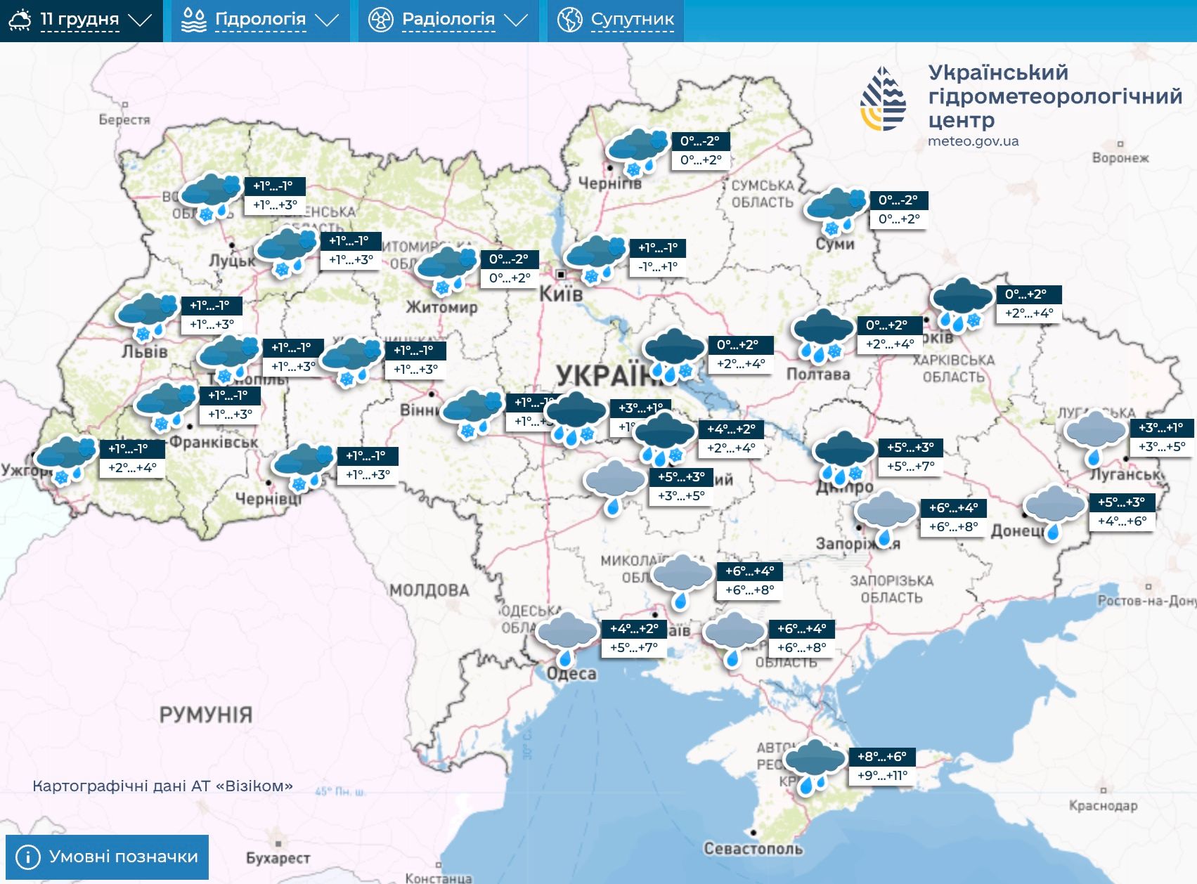 Синоптики прогнозували, що в найближчі три доби буде мокрий сніг і дощ. На Південному Сході переважно дощі. Тільки вдень 12 грудня в Україні, крім Сходу, без істотних опадів.