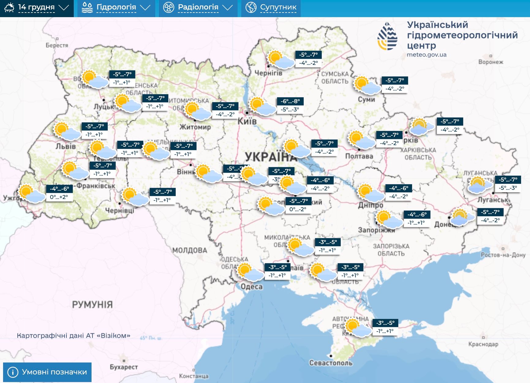 "Температура вночі та вдень від -2 до +4 градусів, 10 – 11 грудня у південній частині вночі 0 – +6, вдень +4 – +11 градусів, 10 грудня у Криму до +14 градусів", – зазначили в Укргідрометцентрі.