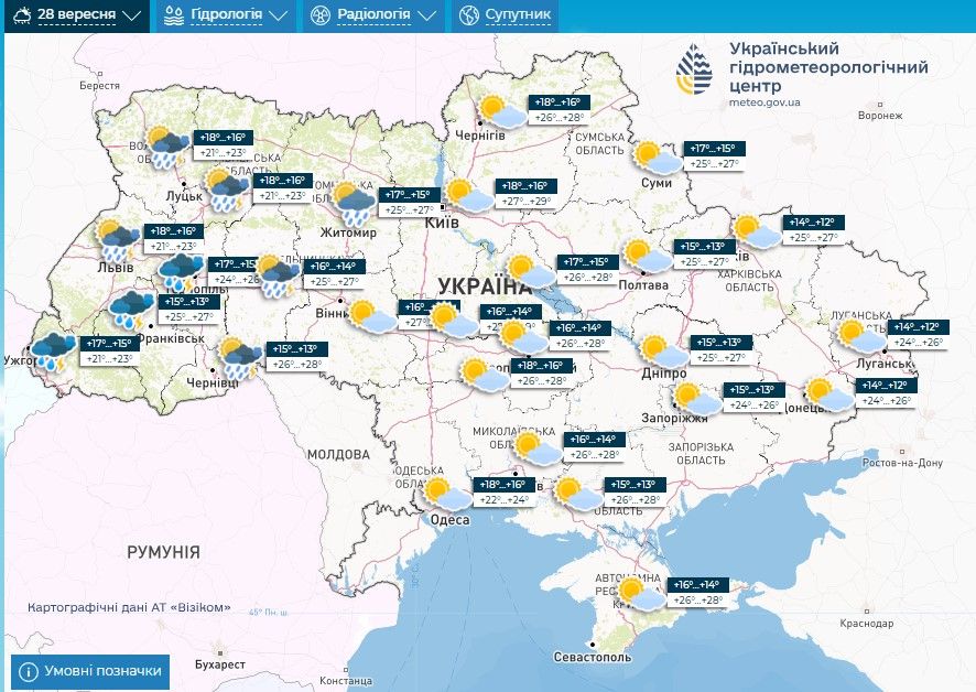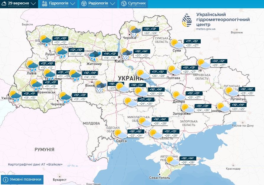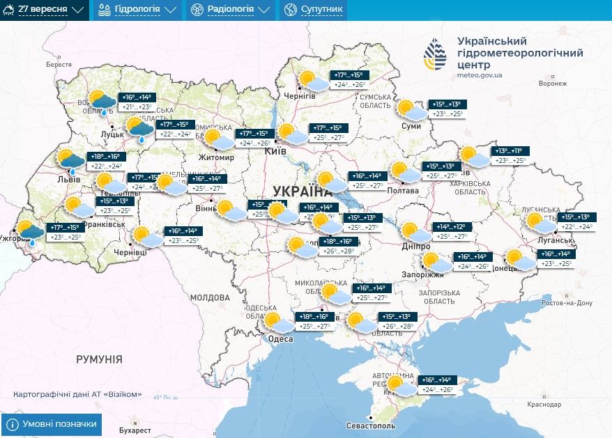 Прогноз погоди на 27 – 29 вересня / Скриншоти з Укргідрометцентру