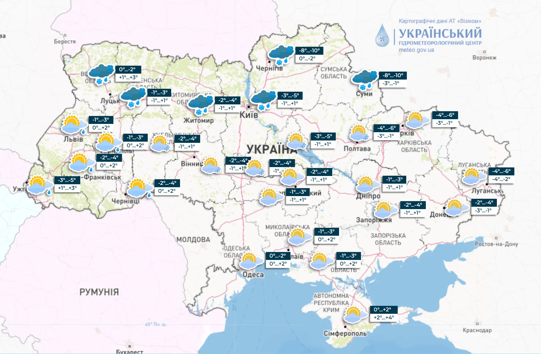 У північних областях очікуються невеликі опади у вигляді мокрого снігу з дощем. Найхолодніше цього разу буде в Сумській області, де ртутний стовпчик термометра може опуститися до -3 градусів.