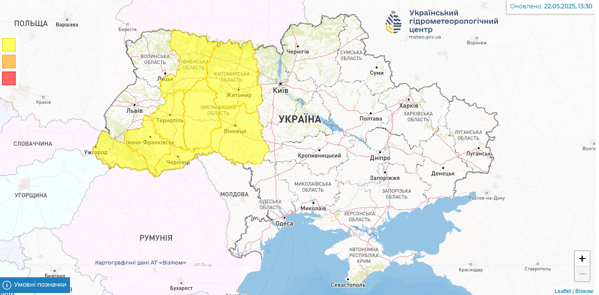- 22 травня у західних та Вінницькій областях очікуються грози, град та шквали, оголошено штормове попередження.