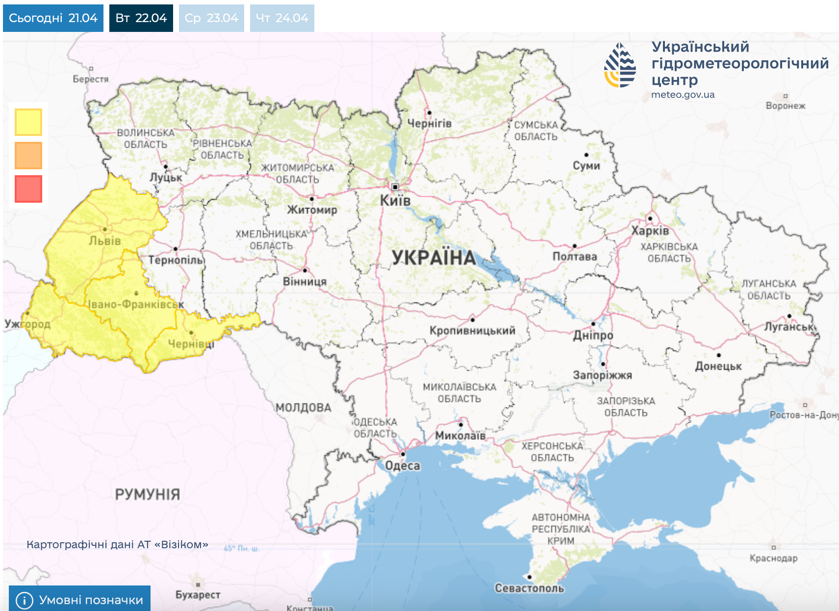 У вівторок, 22 квітня, вдень на Закарпатті та Прикарпатті пройдуть грози. Укргідрометцентр попереджає про I рівень небезпечності (жовтий).