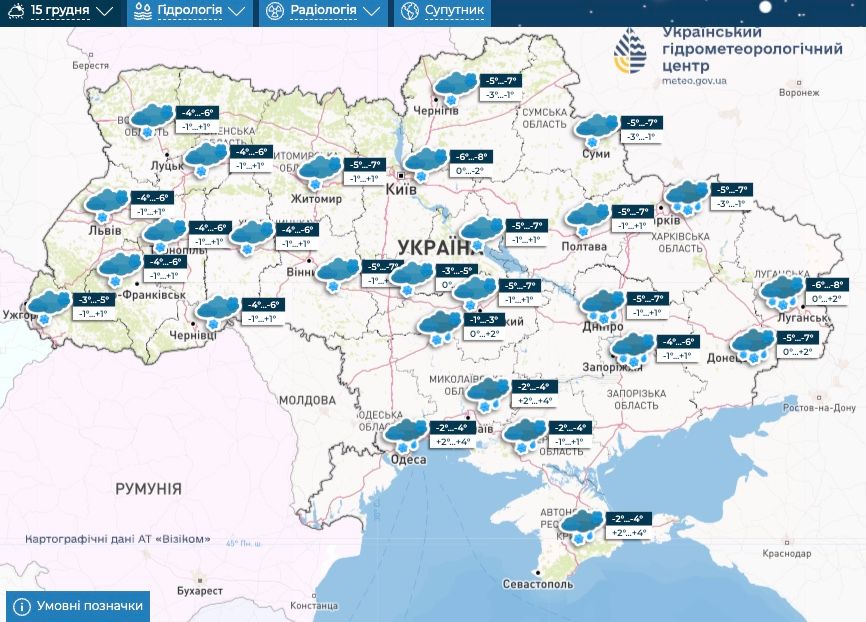 Уже 15 грудня опади, ймовірно, накриють всю Україну. Так, очікується невеликий і помірний сніг, вдень на Півдні та Сході з дощем. Вночі -1 – -9 градусів, вдень від -3 до +2 градусів, на Півдні й Південному Сході до +5 градусів.