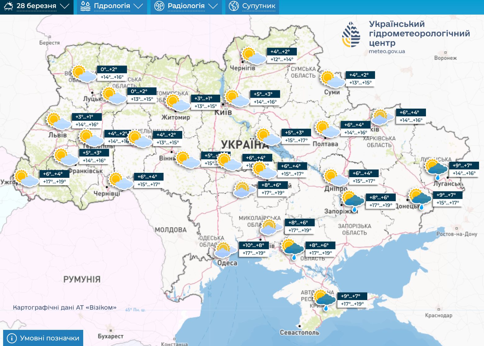До речі, вночі та вранці 28 березня у західних і більшості північних областей подекуди тумани. У найближчі три доби вітер північно-східний та східний, 3 – 10 метрів на секунду, у суботу вдень на Півдні подекуди пориви 15 – 20 метрів на секунду.