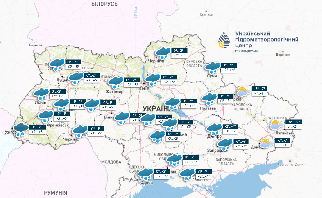 Загалом у переважній частині України у неділю випадуть мокрий сніг та дощ. Найсильніші опади очікуються у південних областях – на Херсонщині та Одещині. Тим часом мокра і сира погода омине Харківщину, Донеччину і Луганщину.