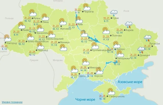Середня температура повітря в Україні вдень коливатиметься від 20 до 25 градусів тепла. У Києві вдень повітря прогріється до +21…+23 градусів і світитиме сонце.