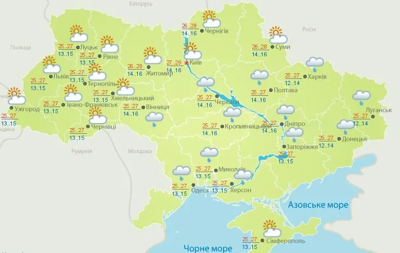 Середня температура на більшості території України сягатиме вдень +25...+27 градусів, вночі повітря охолоне до +13...+15 градусів.