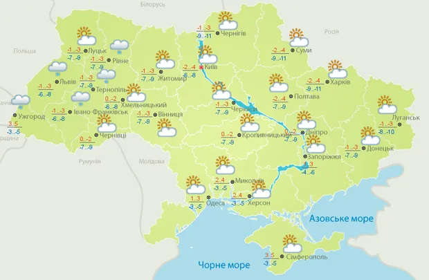 За даним Українського гідрометцентру, температура вночі -6…-11 градусів, на півночі Лівобережжя до -13 градусів, вдень 0…-5 градусів. На Закарпатті та в південній частині вночі -2…-7 градусів, вдень 0…+5 градусів.