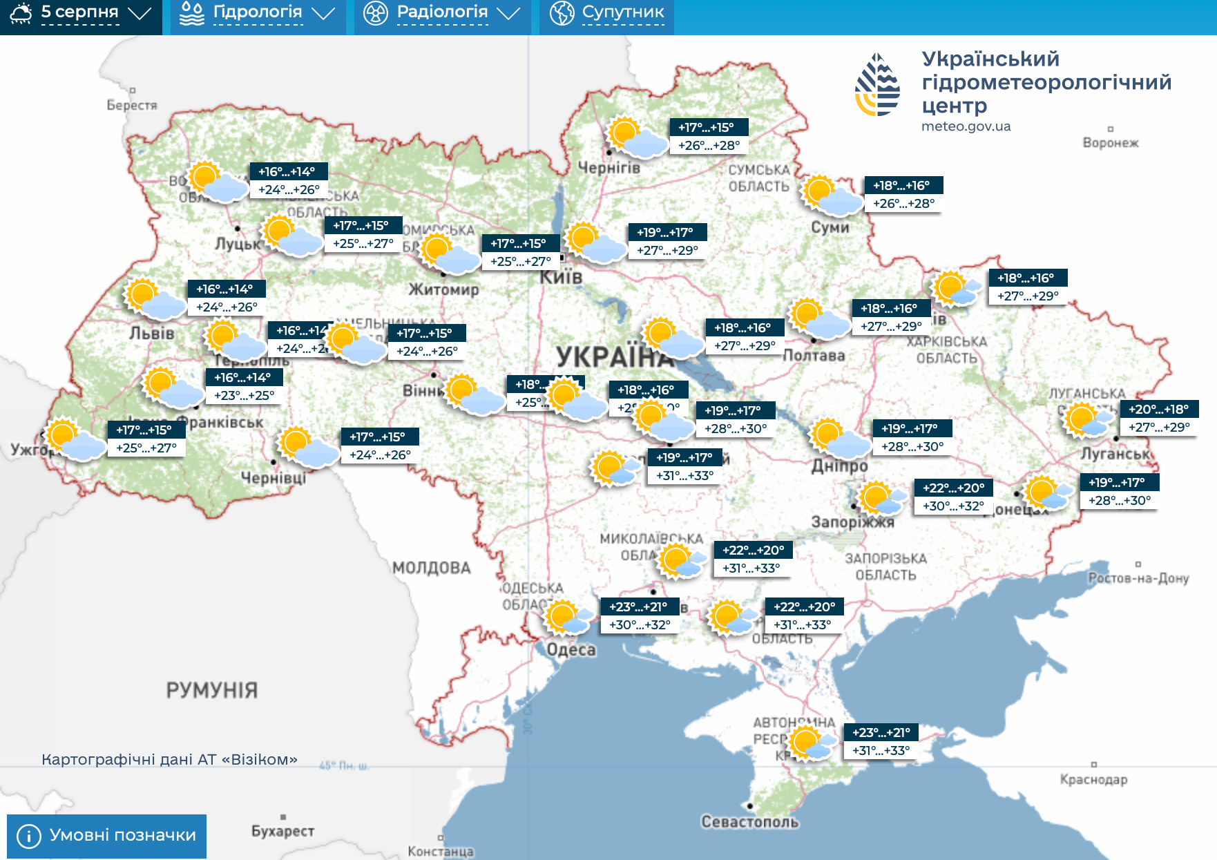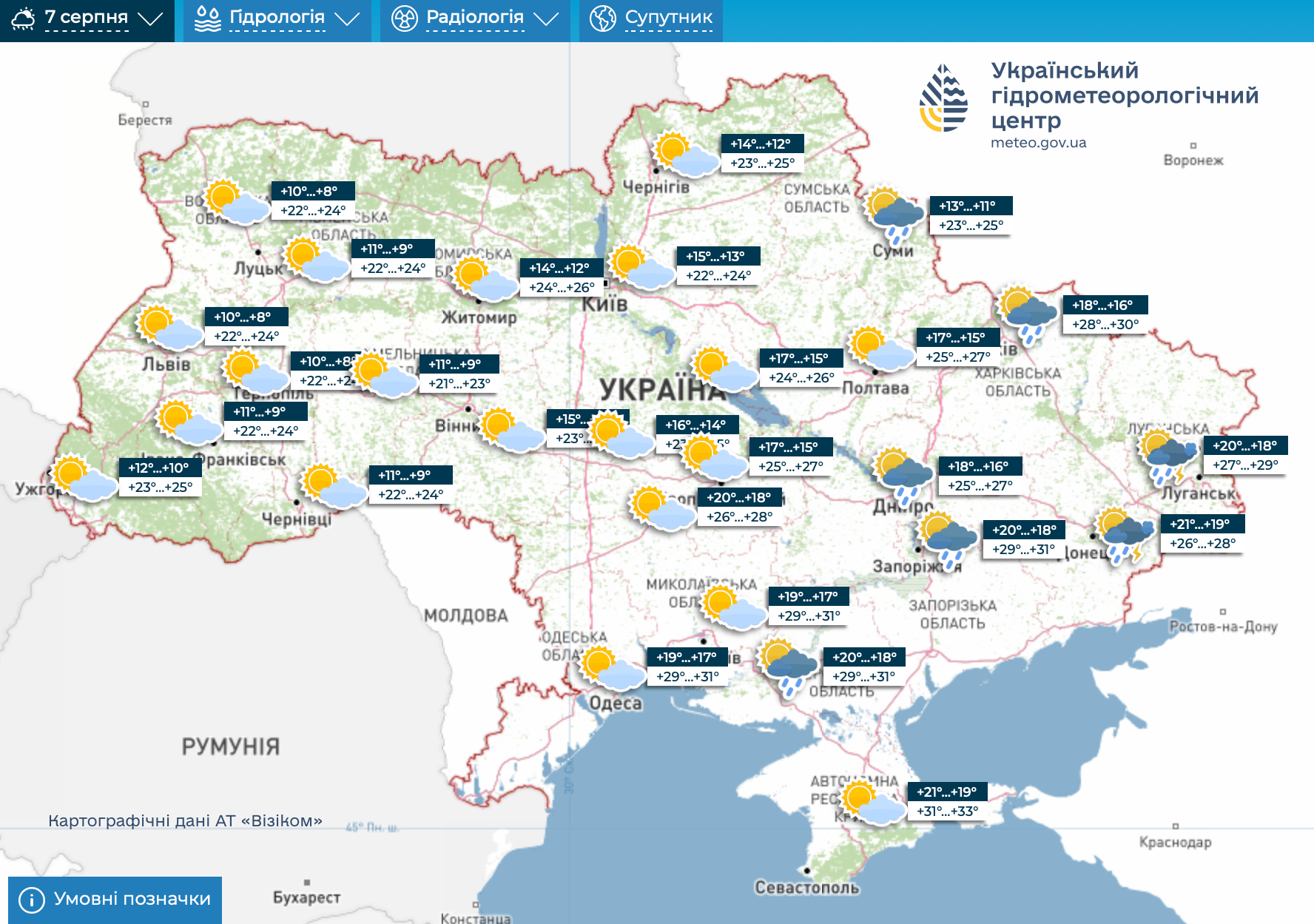 Уже 7 серпня температура повітря знизиться. Так, уночі +10 – +15, на Заході всього +7 – +12, удень +22 – +27, тільки на Закарпатті 8 серпня до +30 градусів. На Півдні й Південному Сході вночі +16 – +21, удень +28 – +33 градуси.