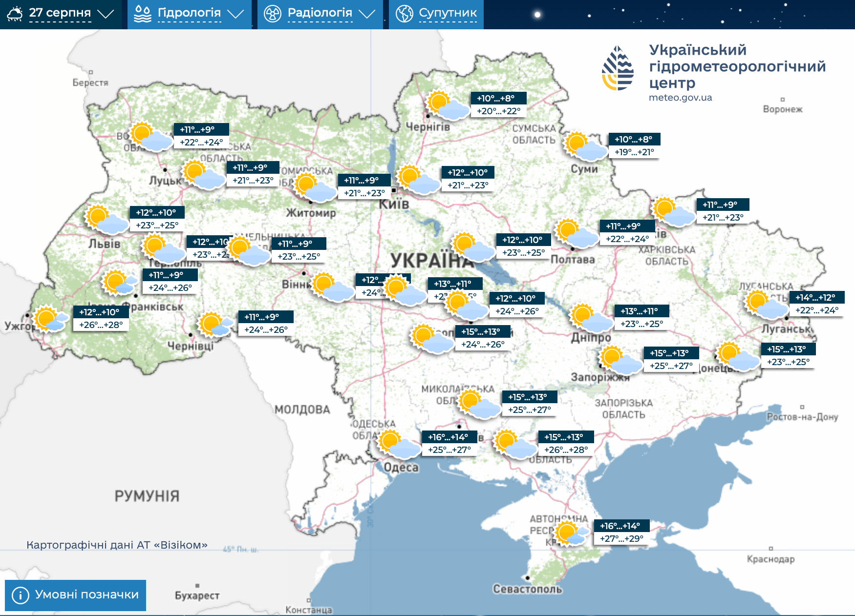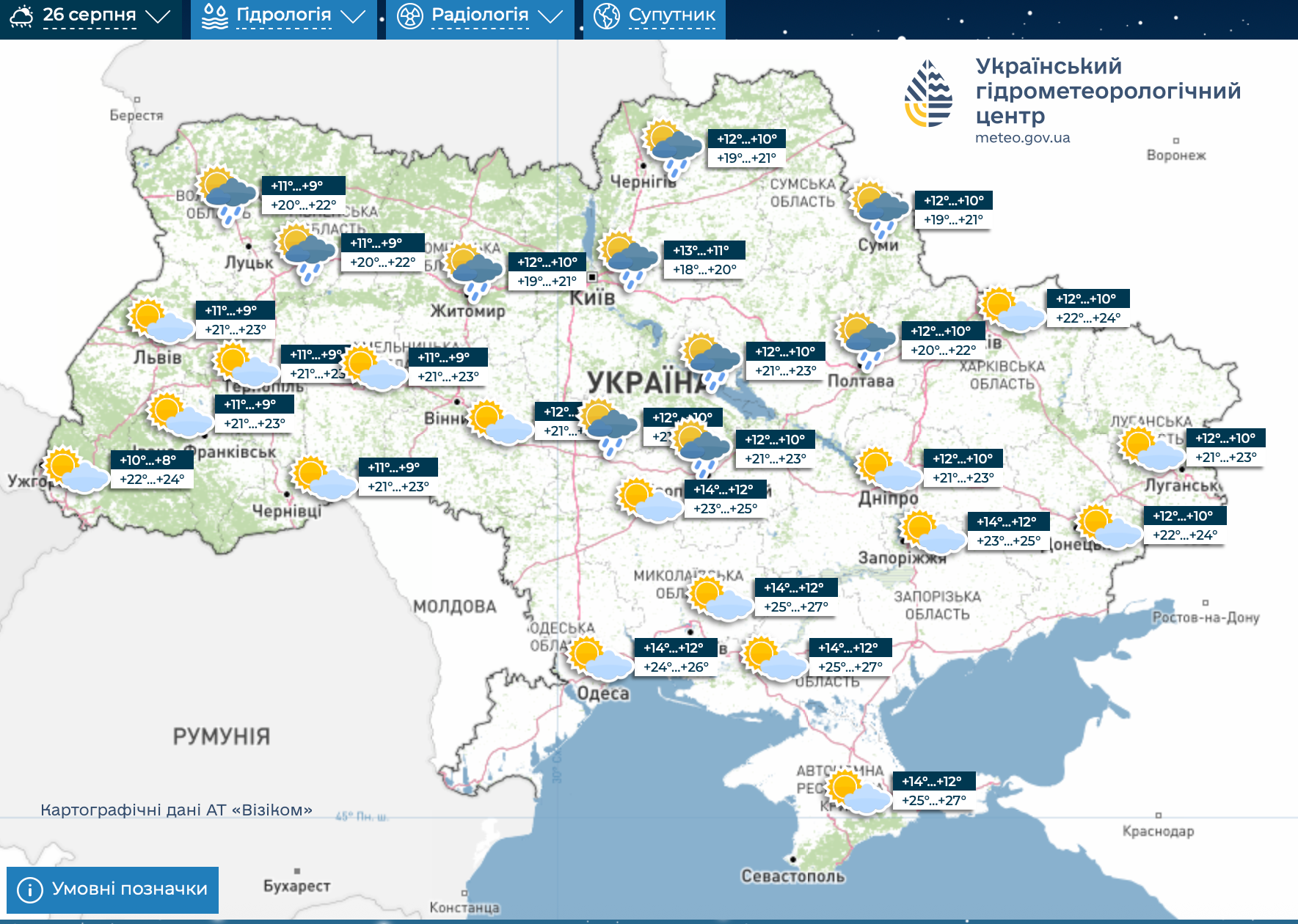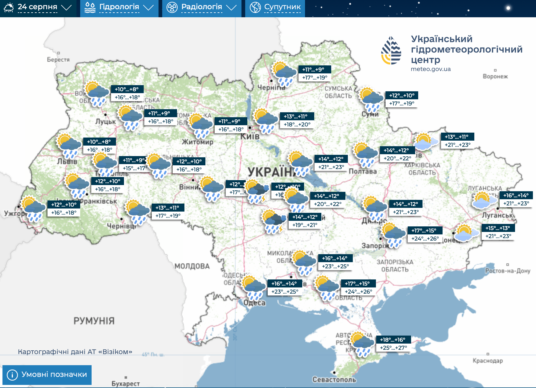 Погода на 24 – 28 серпня / Скриншоти з Укргідрометцентру