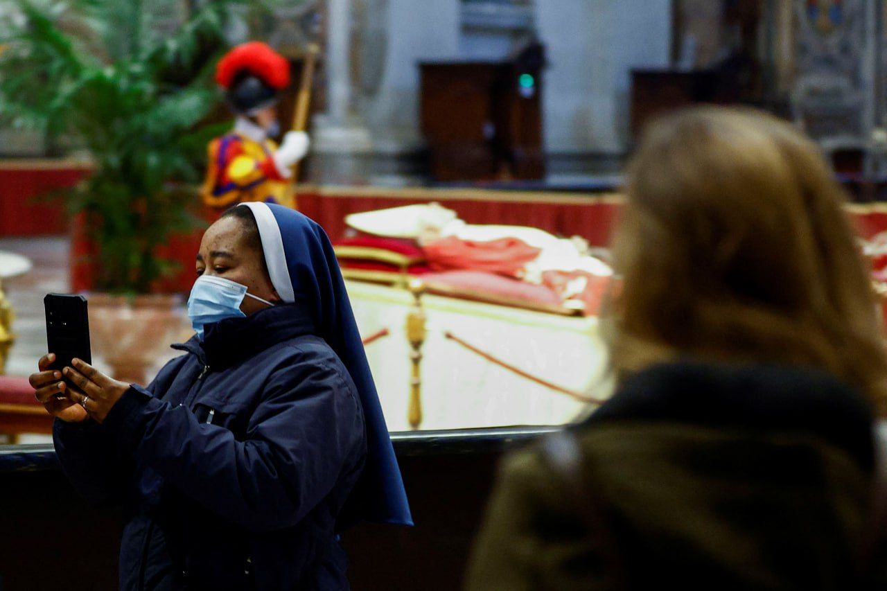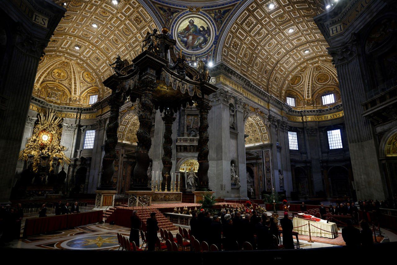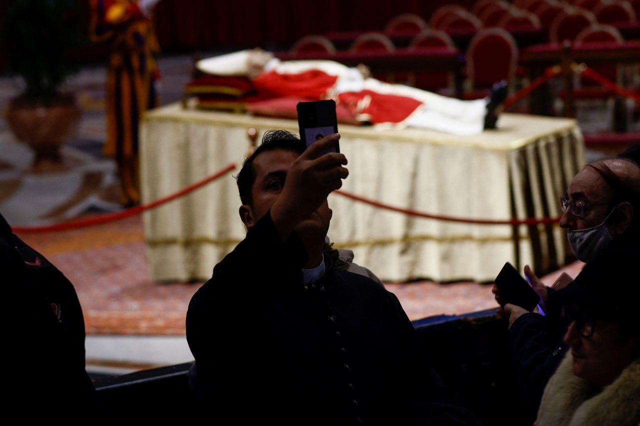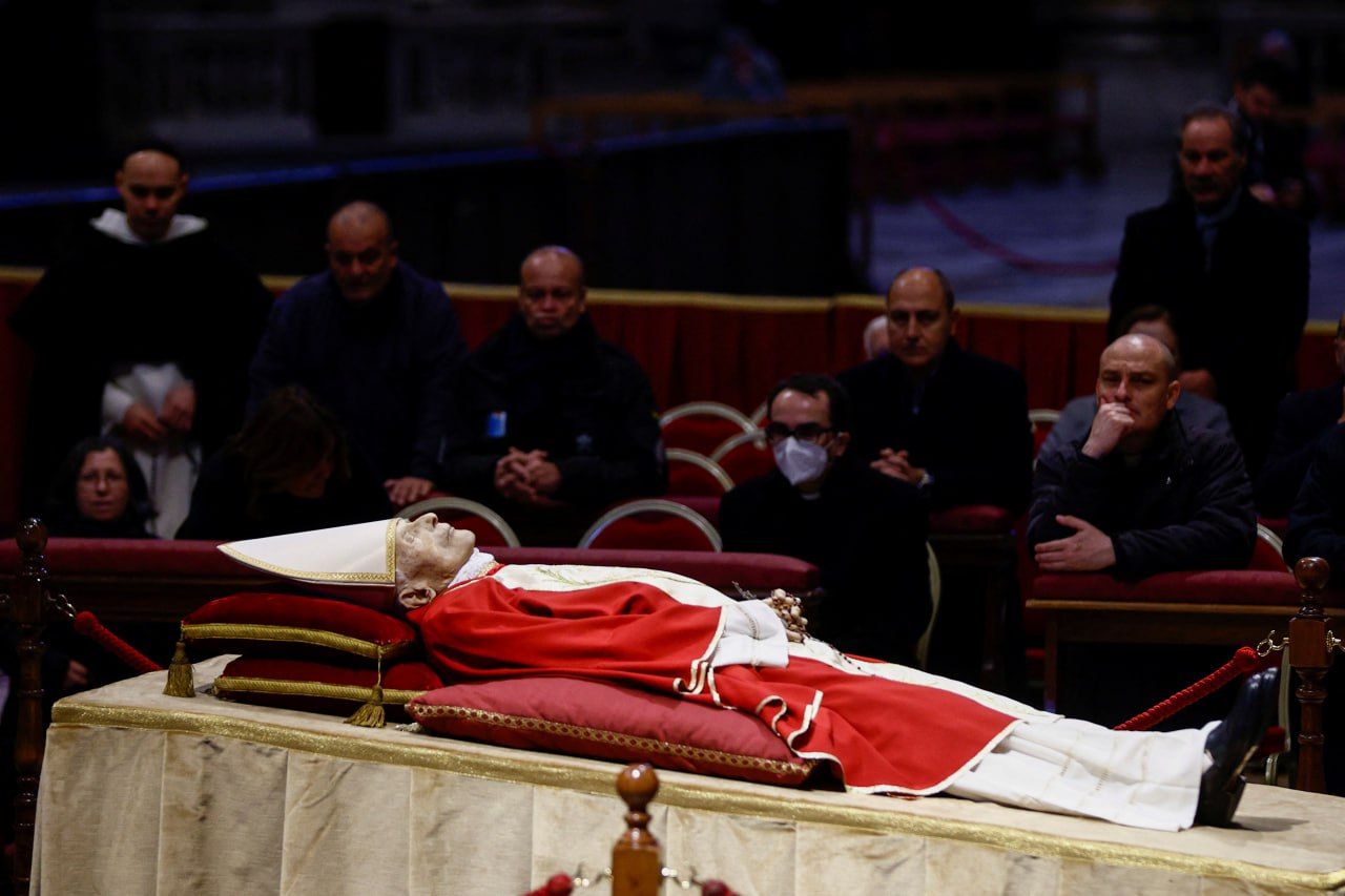 Ватикан опублікував перші фотографії Бенедикта після його смерті, на яких він відпочиває на катафалку в каплиці колишнього монастиря в місті-державі Ватикан, де він провів свій відпочинок.