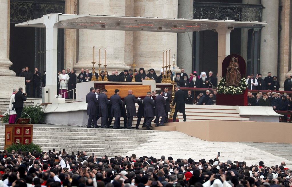 Близько 8:00 із базиліки винесли труну Бенедикта з кипарисового дерева. На ній лежать Святе Письмо, викладене у відкритій книзі, і чотки, якими користувався отець.