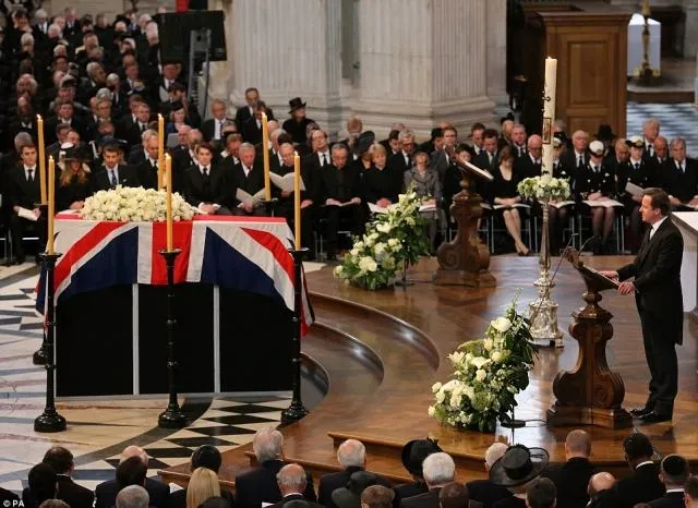 Поминальну службу за колишнім прем'єром Великобританії провів настоятель собору Святого Павла Девід Айзен. Під час богослужіння фрагменти з Євангелія прочитали 19-річна онука Тетчер Аманда та прем'єр-міністр Великобританії Девід Кемерон.