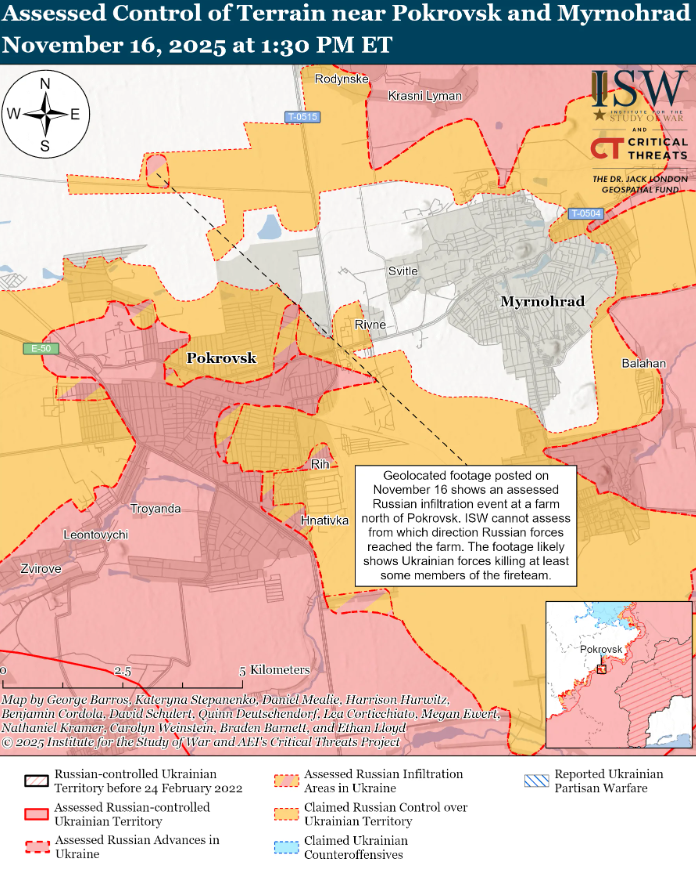 Речник української бригади, що діє на Покровському напрямку, повідомив 16 листопада, що російські війська знову повернулися до тактики інфільтрації у Покровськ невеликими піхотними групами по двоє – троє військових замість механізованих штурмів. Тактика російських інфільтрацій базується на припущенні, що навіть один вцілілий з групи з трьох може закріпитися на позиції, що підкреслює високу ціну таких дій.