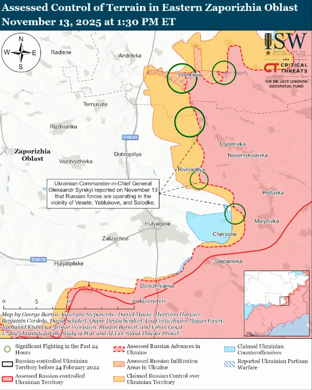 За даними аналітиків, ворожі війська просунулись у радіусі близько дев'яти кілометрів на північний схід та схід від Гуляйполя. Генерал Сирський 13 листопада підтвердив, що російські війська вже діють біля Солодкого, Яблукового та Веселого, що показує – росіяни продовжують доволі швидко просуватися від Гуляйполя. Також росіяни намагаються просуватись у напрямку Данилівки, проводячи інфільтрації далі на північ у напрямку на автомагістралі. Ворог планує оточити Гуляйполе з північного сходу, Водночас за даними аналітиків, наступ з півдня малоймовірний, адже там українська оборона найміцніша.