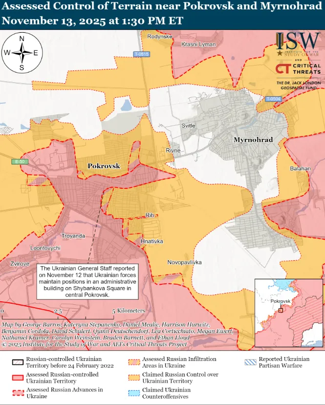 Кремлівські мілблогери заявляють, що їхня армія контролює райони Покровська на південь від залізниці. Однак геолокаційні відеозаписи від 12 та 13 листопада свідчать про те, що українські військові все ще утримують будівлю міськради Покровська та позиції на півночі й північному заході міста. Генштаб повідомляє, що українські сили вибили ворожі підрозділи на західній околиці Покровська та біля північного заходу в'їзду в місто. Також українці очистили позиції на півночі Покровська, забезпечили логістичний шлях і просуваються вздовж Донецької залізниці.