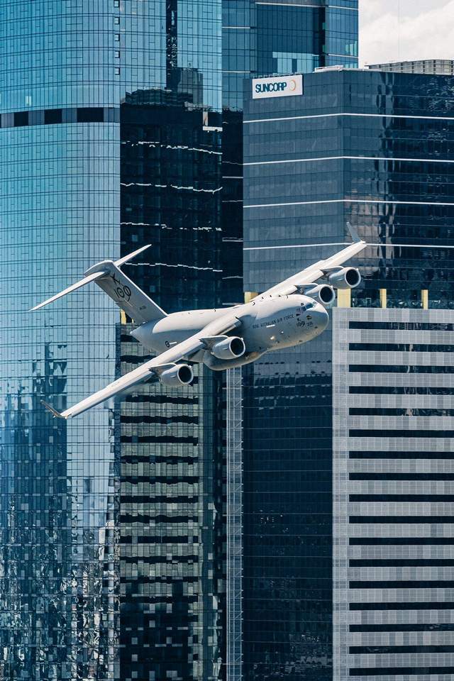 Реактивний літак Королівських австралійських ВПС навмисно перетинає хмарочоси у центрі міста Брісбен. Це була репетиція авіашоу, що викликала негайні спогади до 11 вересня,