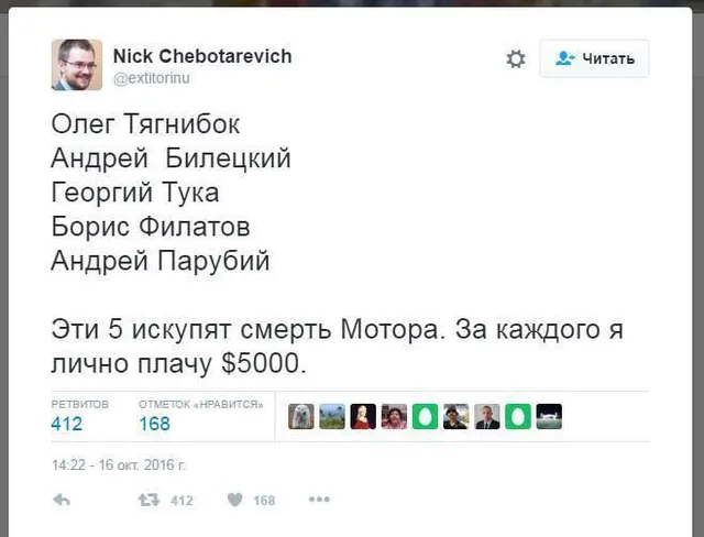 Чоловік пише, що ці люди мають відповісти за життя бойовика "Мотороли". За кожного обіцяє по 5 тисяч доларів.