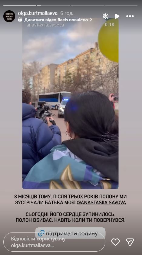 Морський піхотинець Олександр Савов повернувся з російського полону 19 березня 2025 року, провівши у неволі 2 роки і 10 місяців. Його донька, Анастасія Савова, співзасновниця Асоціації морських піхотинців, зустрічала його з прапором. Але він казав, що боїться її обійняти – щоб чимось не заразити.