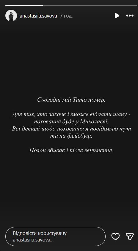 Як повідомила Анастасія Савова, прощання з Олександром буде в Миколаєві. Деталі розкажуть згодом.