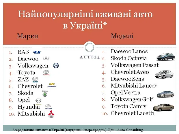 Якщо говорити про рейтинг марок, то тут досі першість тримає російська Lada – дається взнаки велика кількість моделей та великий проміжок часу популярності цієї марки, в тому числі тривале лідерство на ринку нових авто. Загалом, ринок б/в перепродажів на 29% складається з авто виробництва України, Росії та колишнього СРСР.