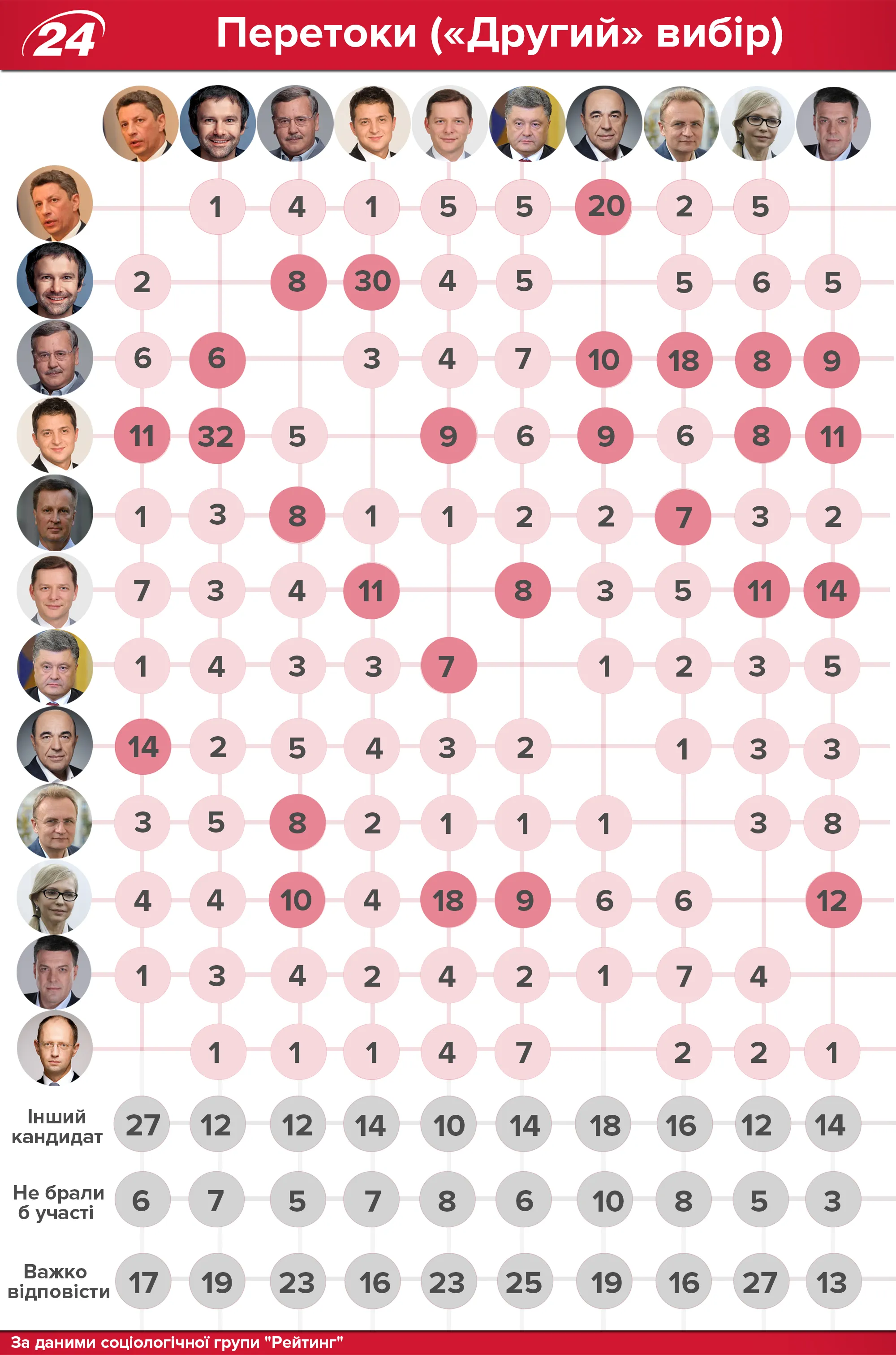 Цікавим є так званий "другий рейтинг" – кого б українці обрали, якби їхній кандидат не брав участі у виборах. Так, наприклад, якби Володимир Зеленський не балотувався, його виборці у більшості голосували б за Вакарчука, потім за Бойка і Тягнибока. Це дослідження показує цікаві альтернативи, наприклад, Вакарчук – Зеленський, Бойко – Рабінович, Садовий – Гриценко, Тимошенко – Ляшко.