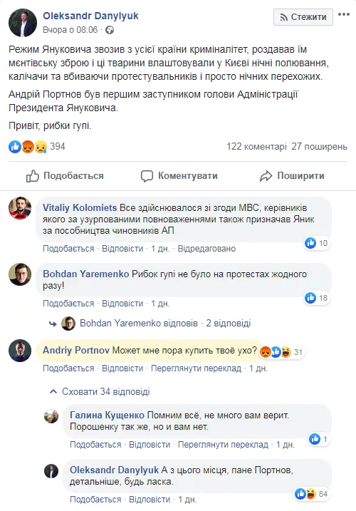 Данилюк відреагував на коментар Портнова, попросивши більше деталей щодо цієї заяви. Втім, екс-заступник глави адміністрації Януковича так і не відповів, щонайменше у коментарях.