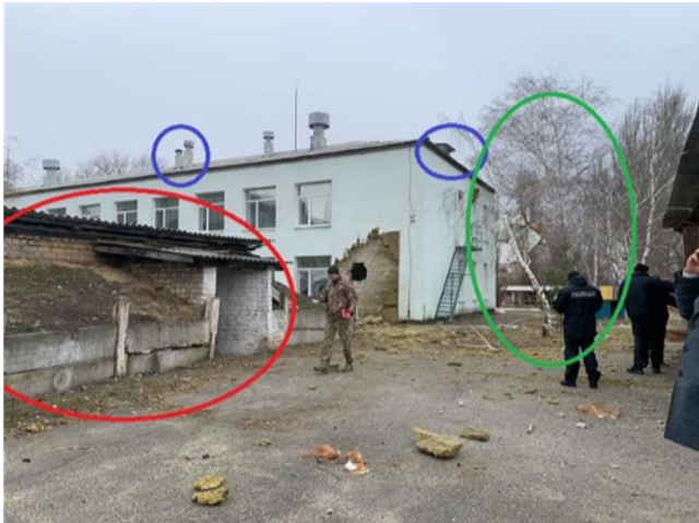 Водночас кут ураження боєприпасу, який завдав руйнувань будівлі дитсадка, становить практично 90 градусів до фасаду та орієнтовно має напрямок ймовірної точки пострілу — азимут 128 – 131 градус на південний схід.