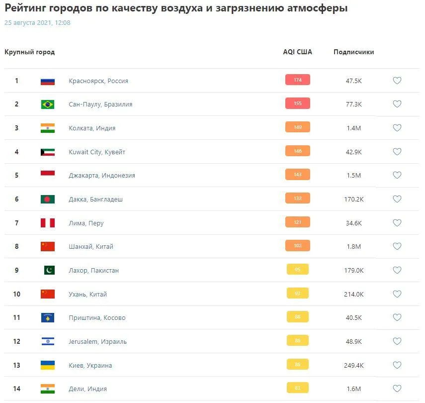 Станом на 09:55 ранку середи, 25 серпня, індекс Києва становив 105 при нормі в 50. Столиця України перебувала на 10-му місці в антирейтингу.