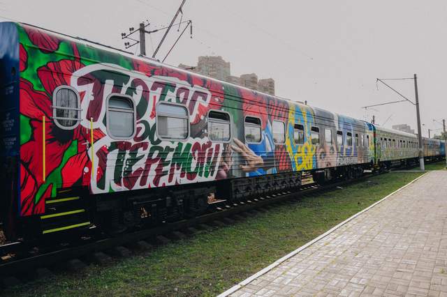 Проєкт "Потяг до перемоги" – це 7 вагонів, розписаних українськими митцями. Кожен вагон присвячений окремій тимчасово окупованій території України та подвигам людей, які чинять опір російським військам,