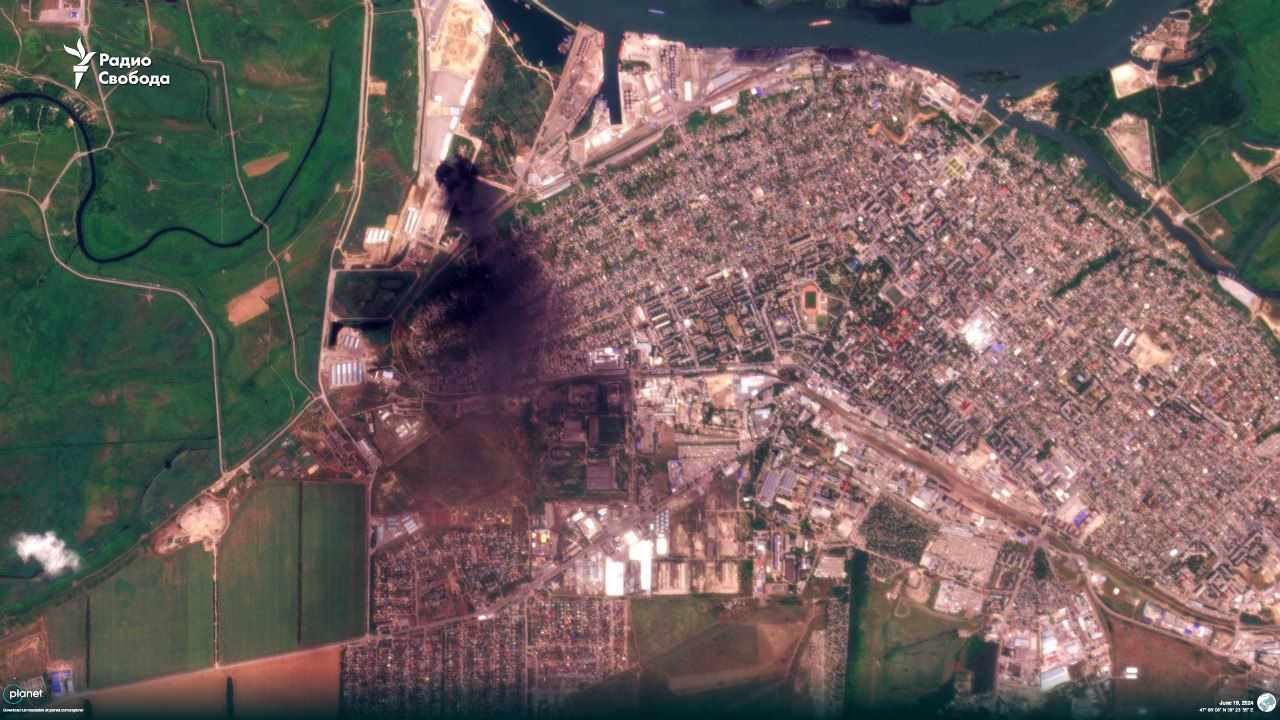Ось так пожежа на нафтобазі компанії "Азовпродукт" у Ростовській області Росії виглядала на знімку з космосу вчора, 19 червня, через добу після атаки українських дронів.
