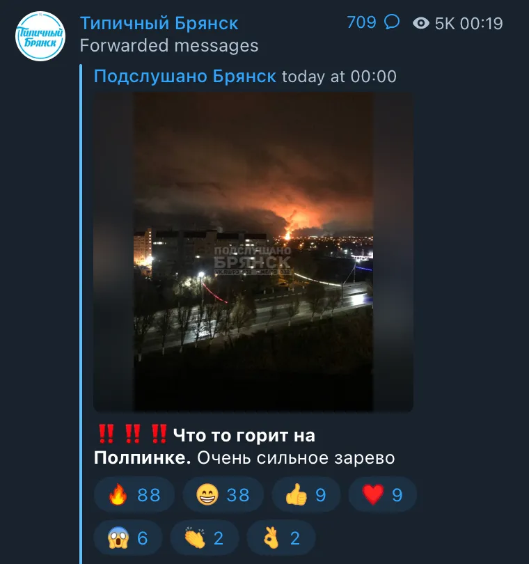 Пізніше стало відомо, що палала будівля у селищі Велике Полпіно, що під самим Брянськом. На фото та відео можна побачити, що споруда вигоріла вщент. Але, судячи з реакцій, наприклад, у телеграм-акаунті "Типичный Брянск", люди не надто засмутилися. Більшість реакцій з вогником або усміхненими емодзі. Мабуть, люблять ж росіяни, коли у них же щось горить.
