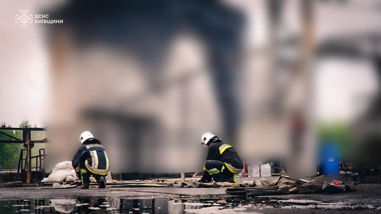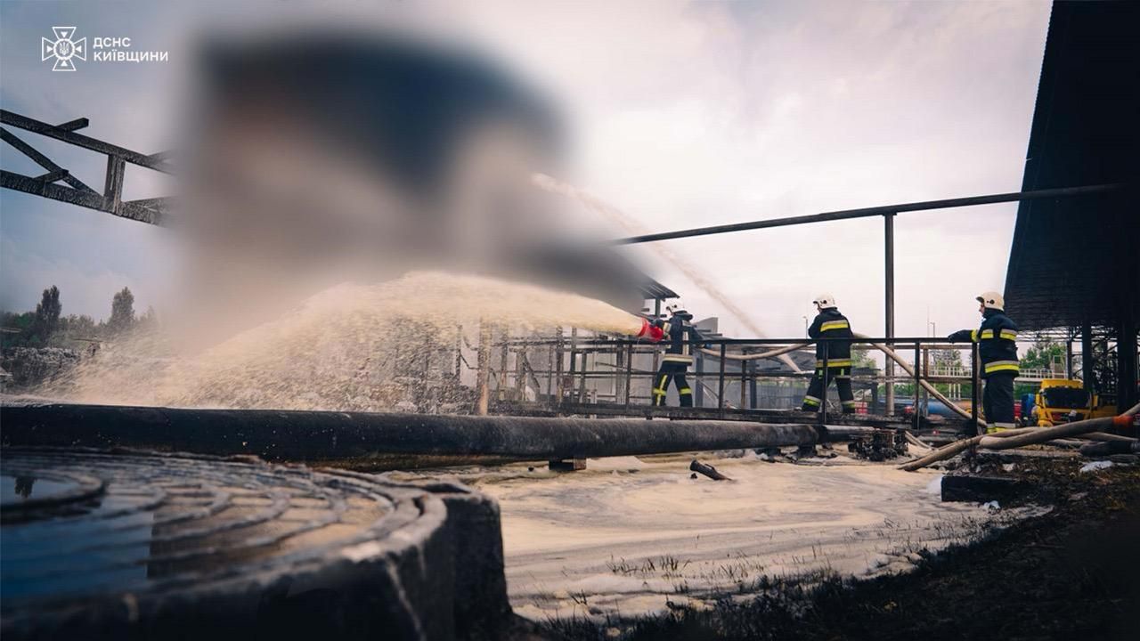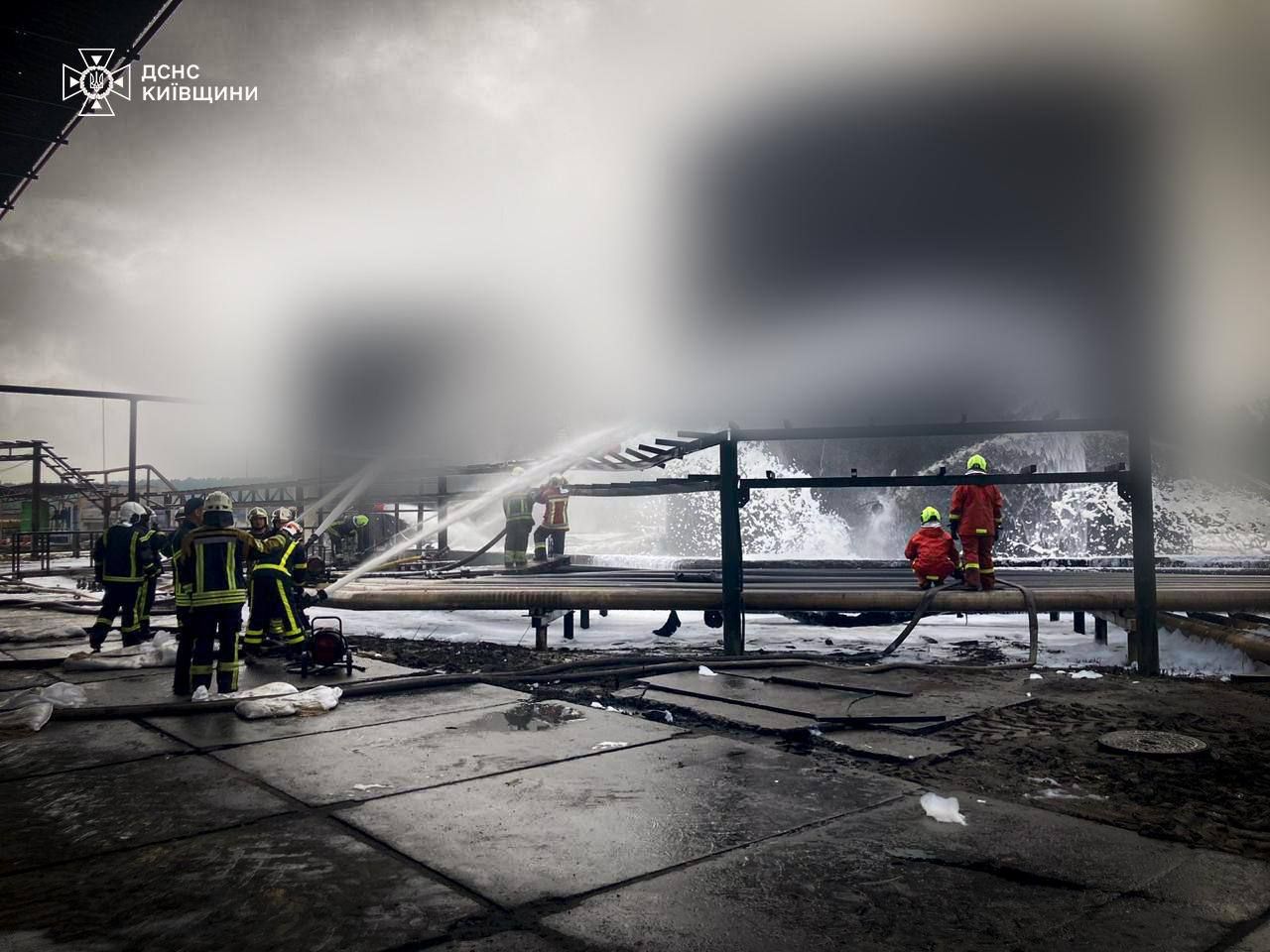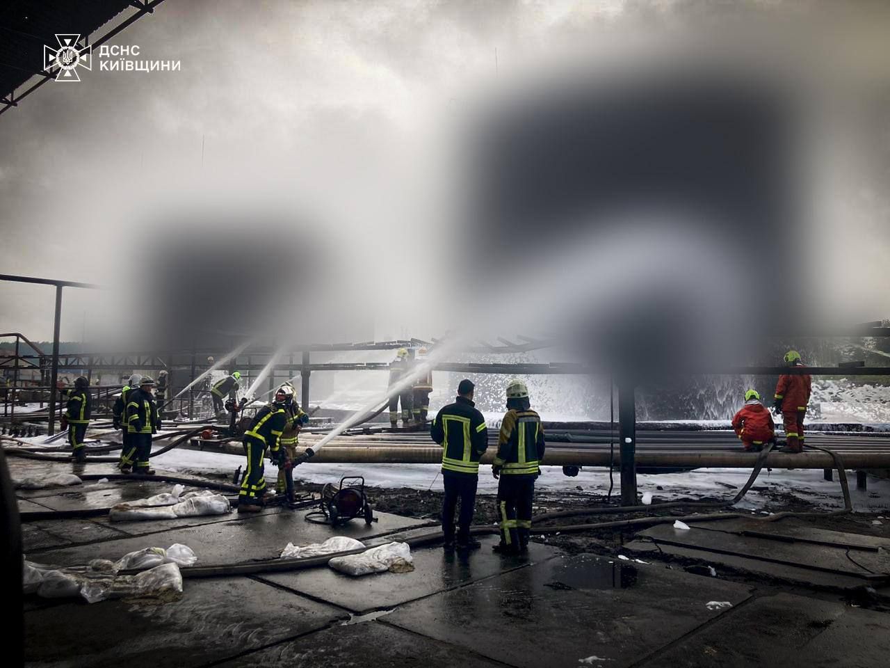У ДСНС розповіли, що станом на 12:00 продовжуються роботи на промисловому об'єкті у Київській області. Рятувальники проводять там охолодження та укладку пінної подушки.