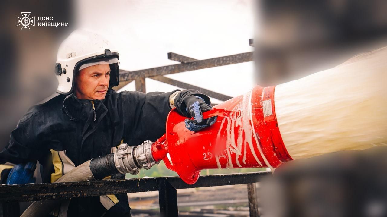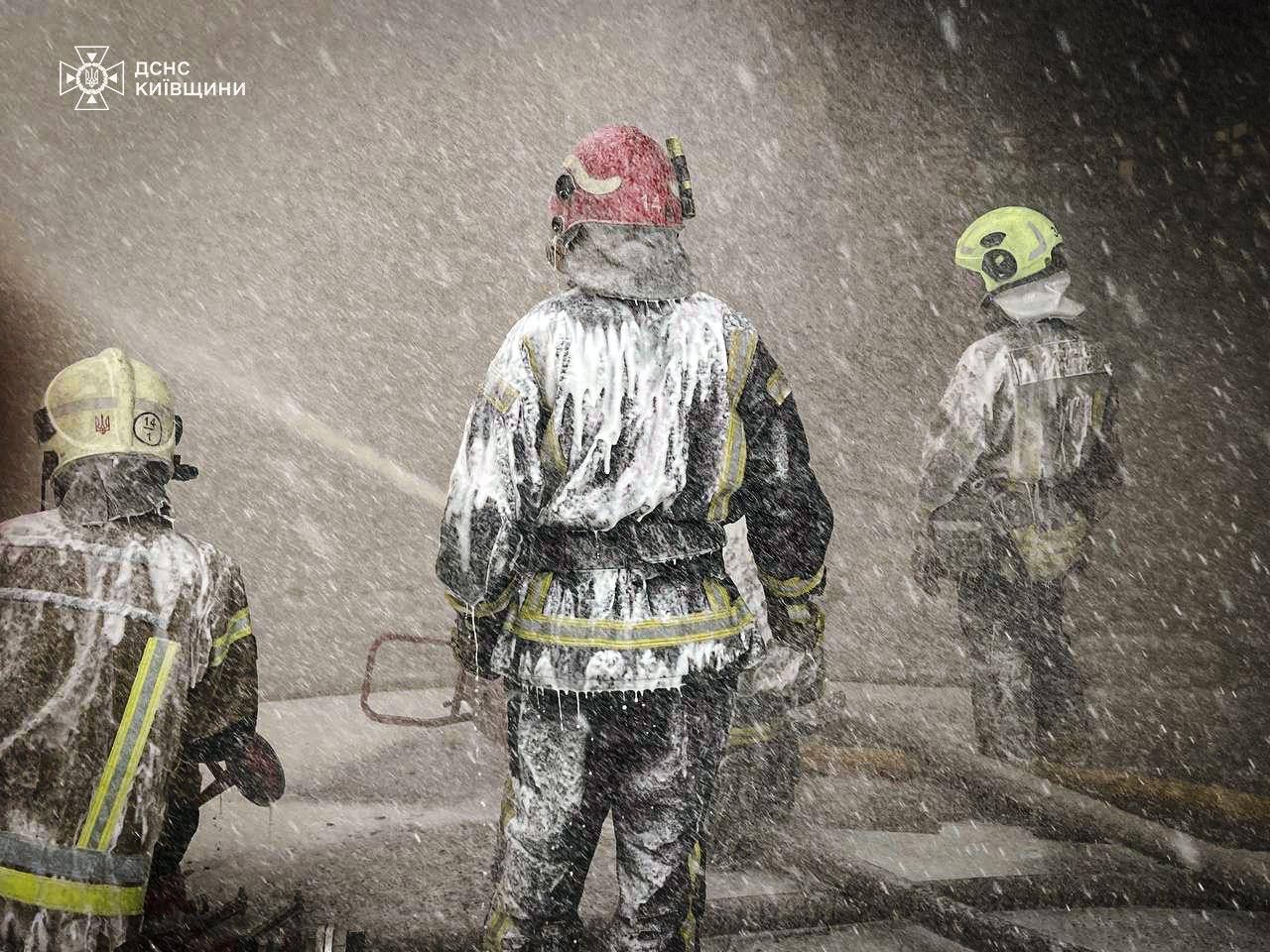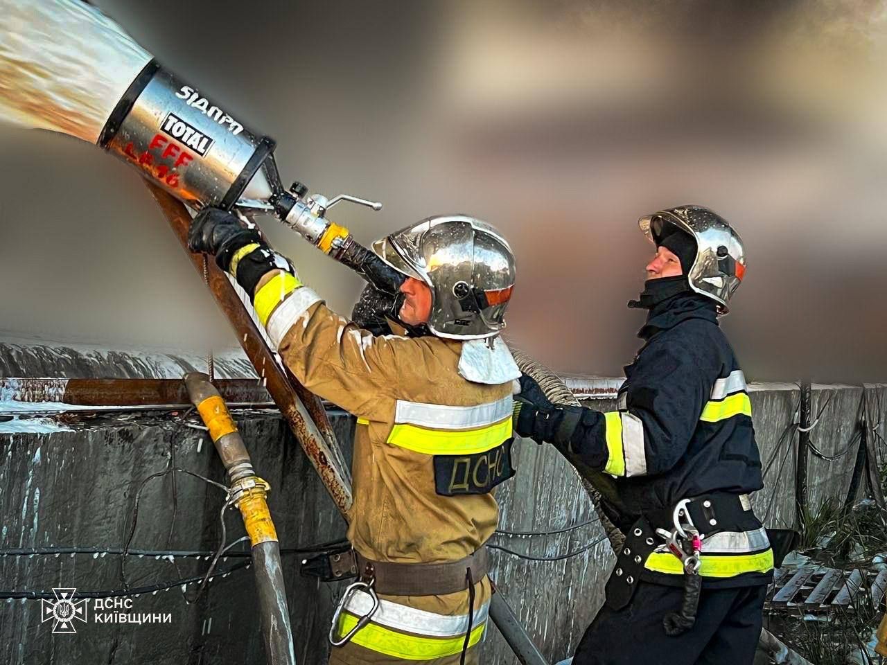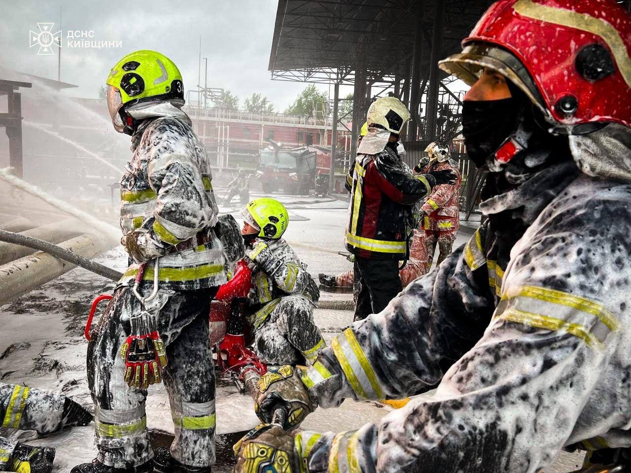 У ДСНС розповіли, що станом на 12:00 продовжуються роботи на промисловому об'єкті у Київській області. Рятувальники проводять там охолодження та укладку пінної подушки.