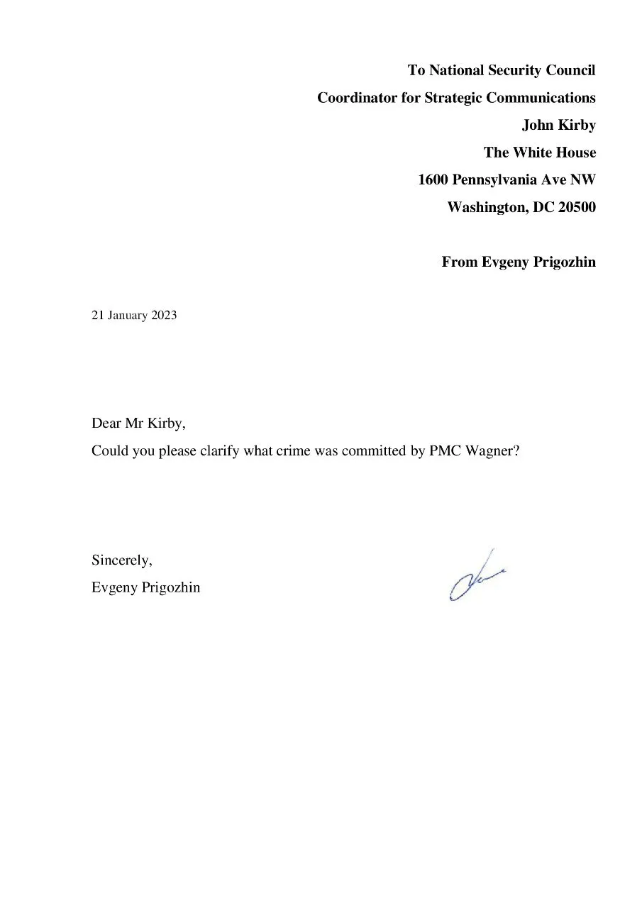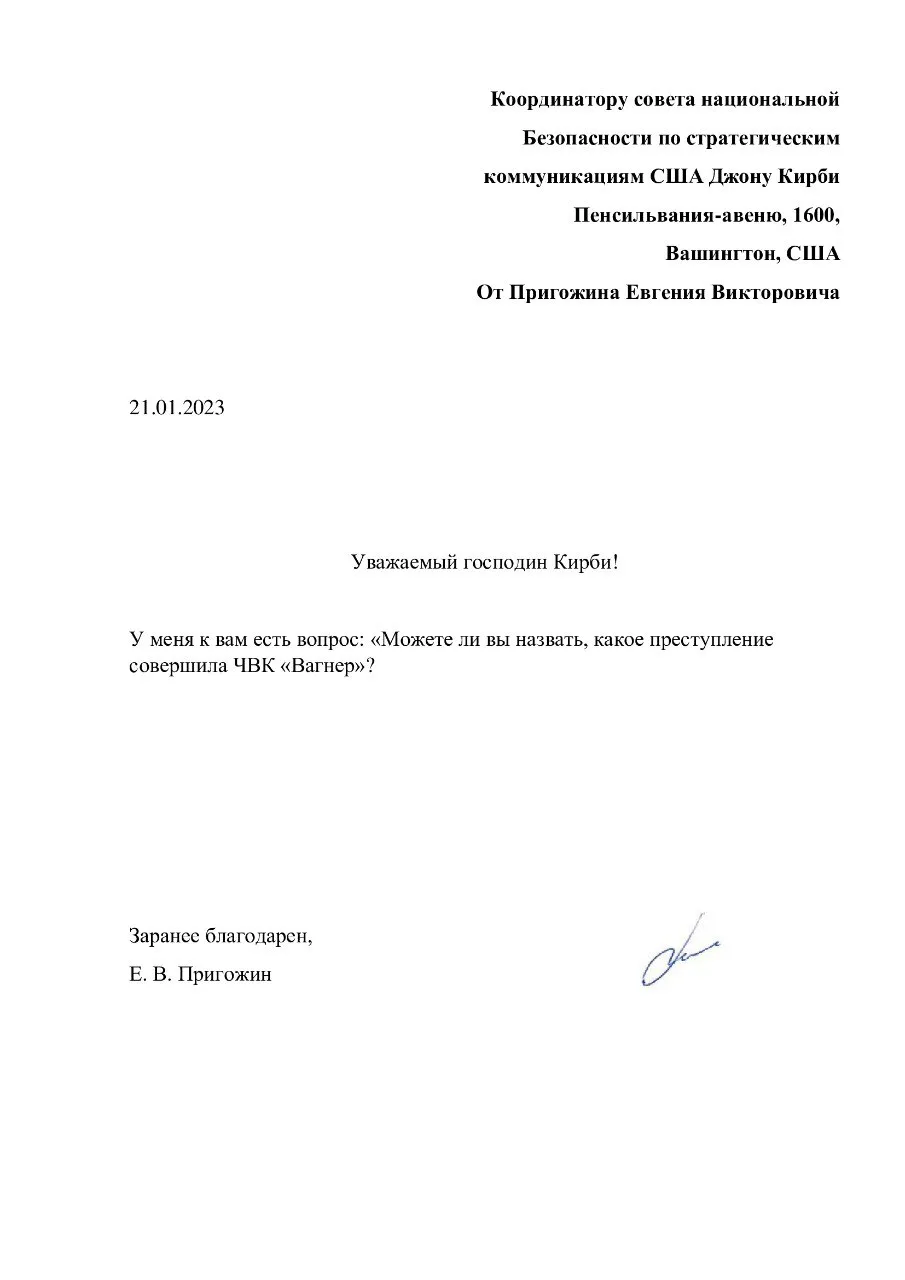 Послання Пригожина досить лаконічне. Свого листа він адресував речнику Білого дому з питань національної безпеки Джону Кірбі.