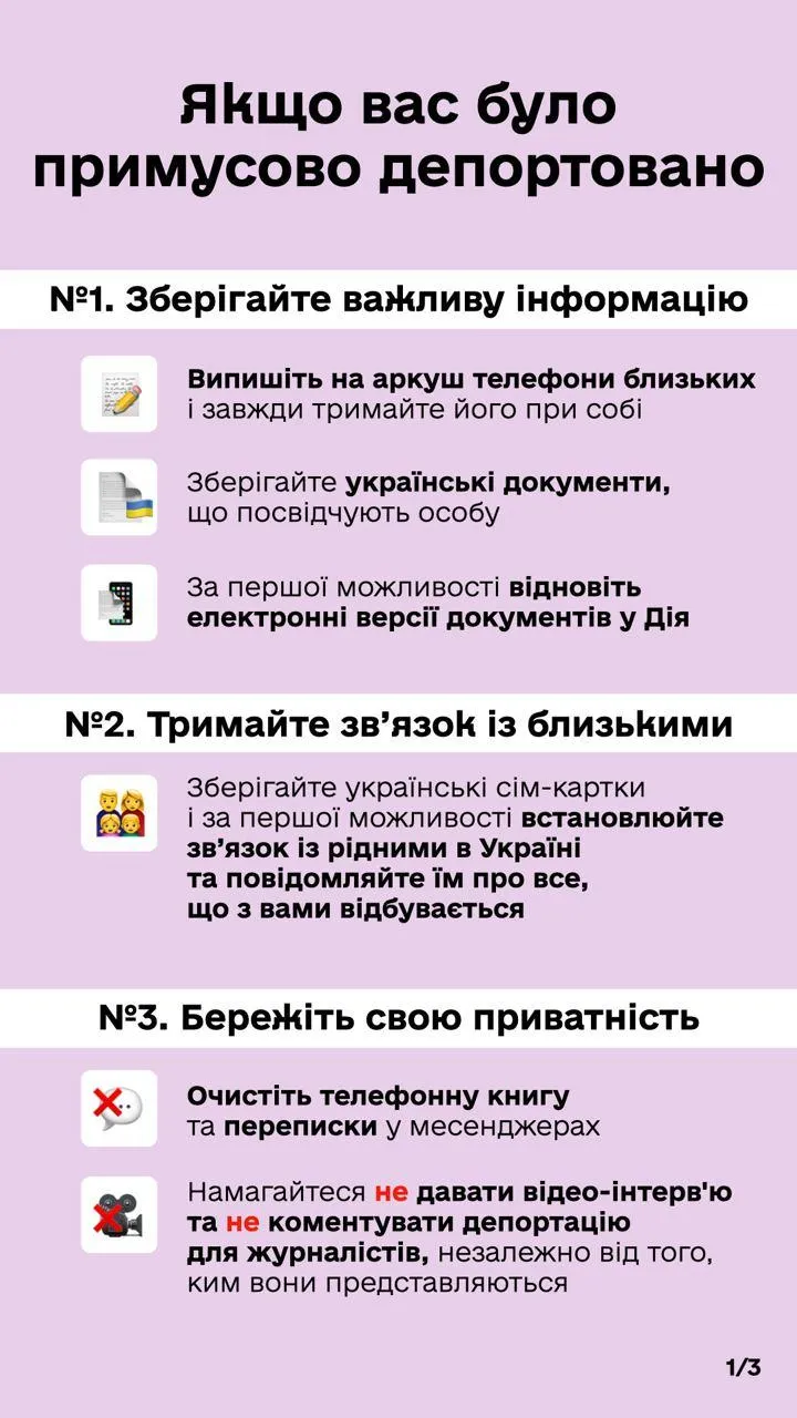 - Намагайтеся не давати відеоінтерв'ю та не коментувати депортацію для журналістів, незалежно від того, ким вони представляються.