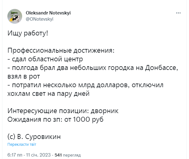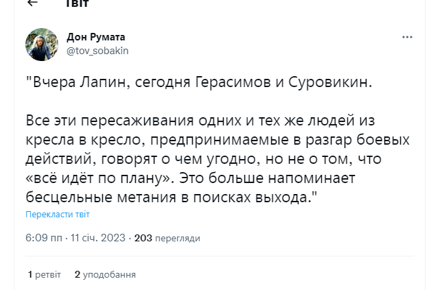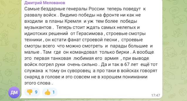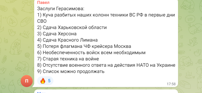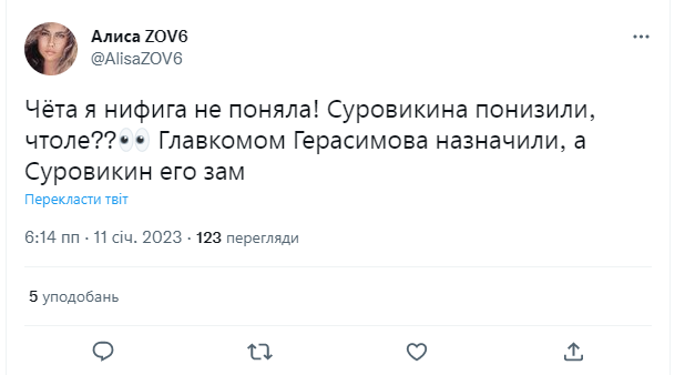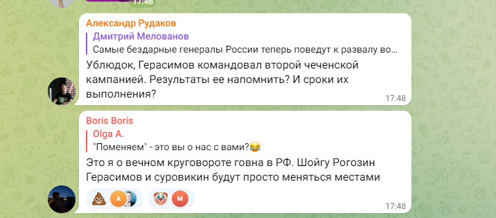 Навіть громадяни країни-терористки не вірять у "таланти" Герасимова. До слова, Сергій Суровікін тепер стане його заступником.