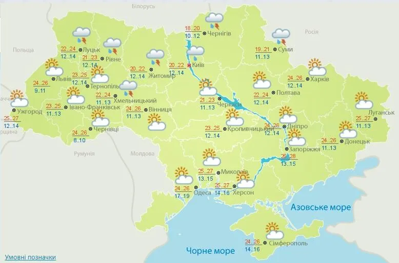 Упродовж дня стовпчик термометра в середньому сягне +20… +25 градусів. Найспекотніше буде у південній частині України та на Закарпатті +25... +28 градусів.